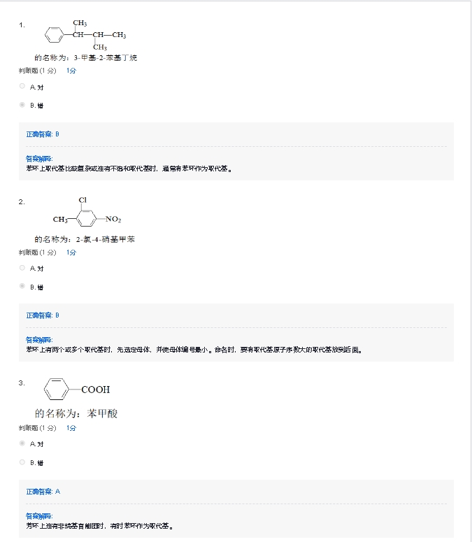 2. 苯环上有两个或多个取代基时,先选定母体,并使母体编号最小。命名时,要将取代基原子序数大的取代基放到后面。答案为错误。